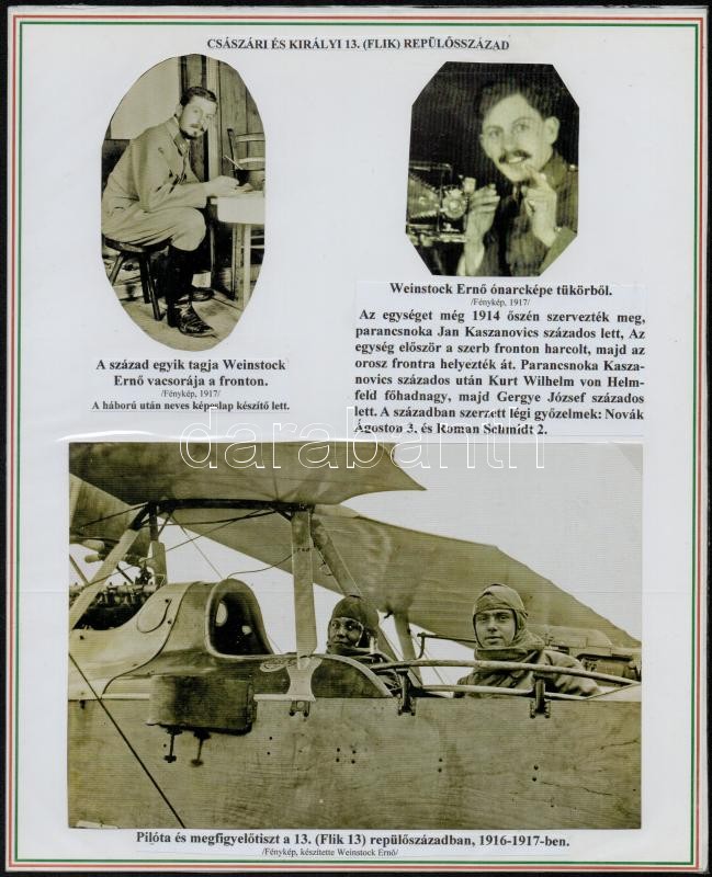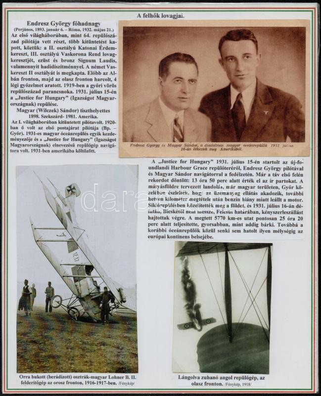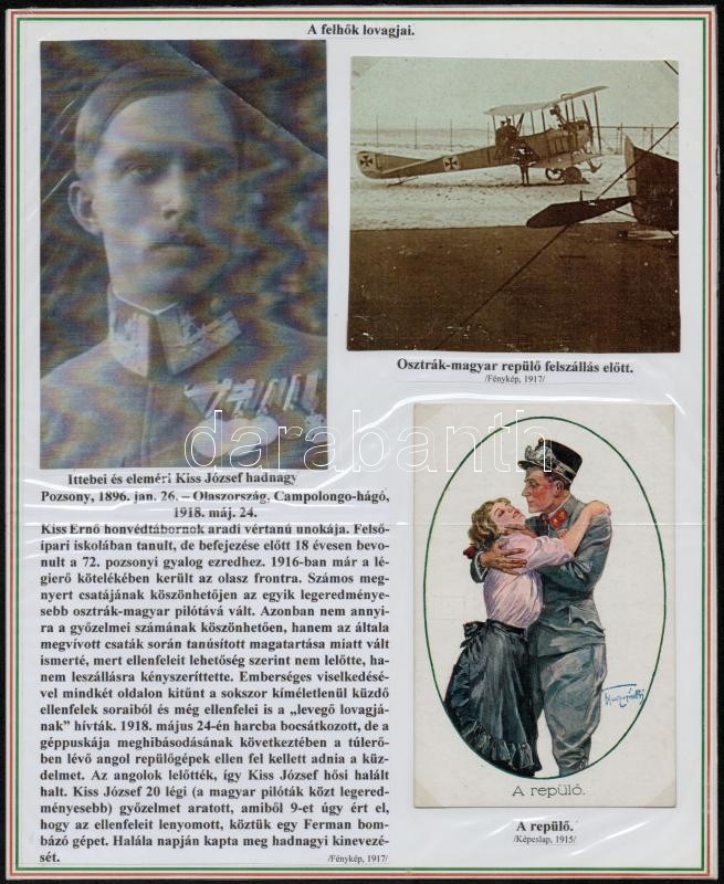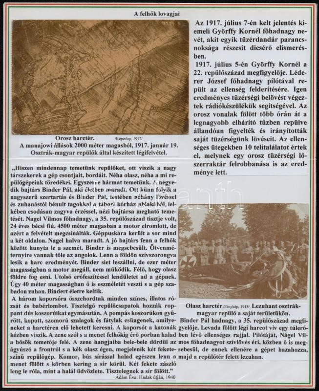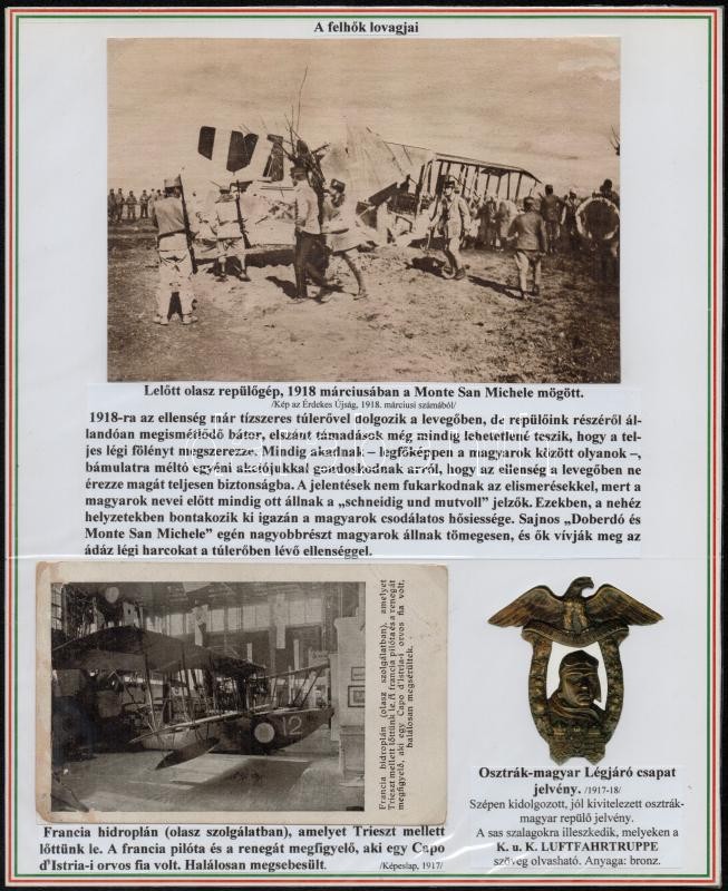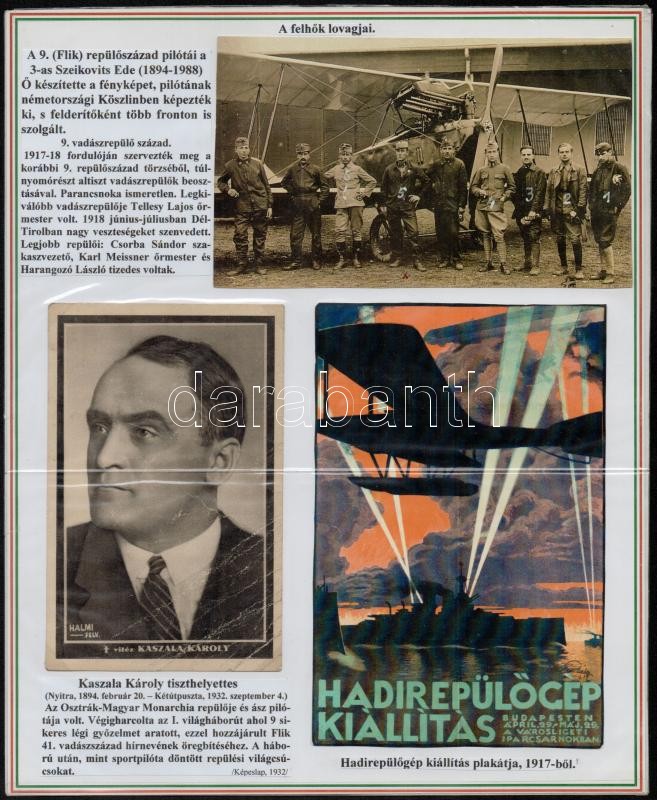 1914-1930 Repülés az I. világháborúban 6 db eredeti képeslapot és fotót plusz 11 reprodukciót tartalmazó bemutató nemzetiszín tablókon (nem felragasztva) kísérő szöveggel / Flying in WW. I. 6 original and 11 later photos and postcards on sheets (not glued)