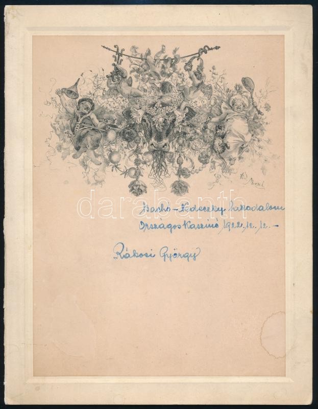 Leírás: 1922 Kőnyomatos menükártya borító, hátoldalán aláírásokkal
