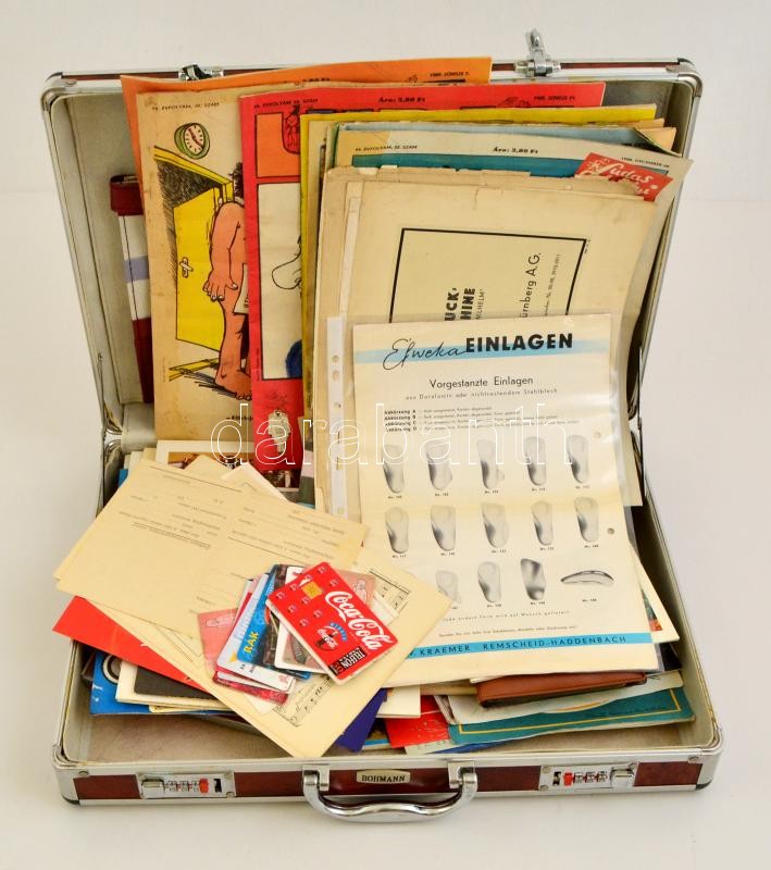 Leírás: Egy aktatáskányi vegyes papírrégiség tétel: kisnyomtatványok, reklámok, telefonkártyák, stb., érdekes darabokkal