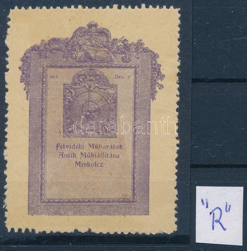 1913 Felvidéki Műbarátok Antik Műkiállítása, Miskolc levélzáró "R" https://www.darabanth.com/hu/314-Gyorsarveres/314.0/Festmeny-mutargy-papirregiseg-egyeb/Parafilatelia~100014/1913-Felvideki-Mubaratok-Antik-Mukiallitasa-Miskolc-levelzaro-R~II1724369
