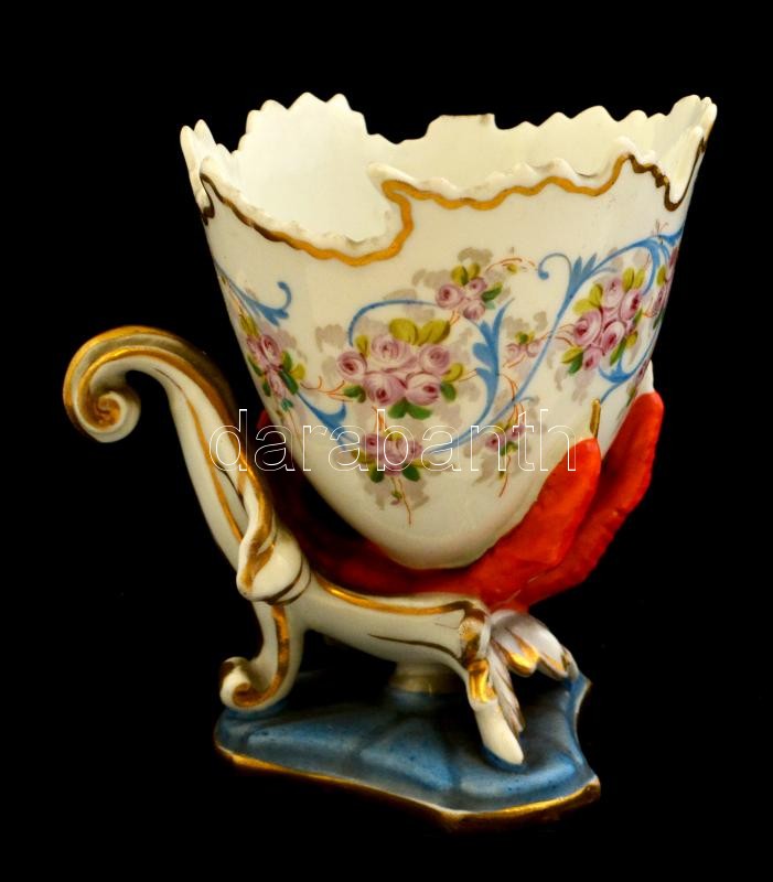 Leírás: Virágmintás porcelán tojástartó, kézzel festett, jelzett, kopásnyomokkal, m: 8,5 cm