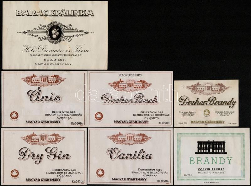 Leírás: cca 1930 7 db különféle italcímke, köztük Corvin Áruház, Dreher Antal, Hobé Damase és Társa, 6x8,5 cm