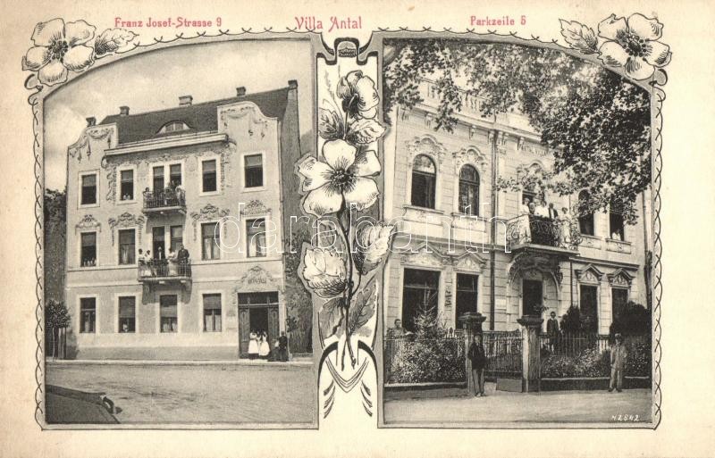 Pöstyén, Piestany; Antal Villa / Franz Josef Strasse 9., Parzeile 6. /... https://www.darabanth.com/hu/314-Gyorsarveres/314.0/Kepeslapok/Felvidek~400007/Postyen-Piestany-Antal-Villa-Franz-Josef-Strasse-9-Parzeile-6-villa-Art-Nouveau-floral~II1721608
