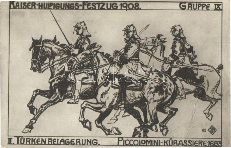 1908 Kaiser-Huldigungs-Festzug in Wien. Gruppe IX. Türken Belagerung. Piccolomini-Kürassiere 1683. / Emperor Franz Joseph's anniversary military parade, Turkish soldiers in uniforms (fa)