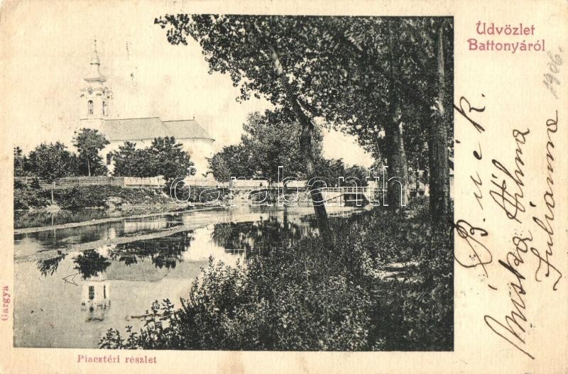 Leírás: Battonya, Piac tér, templom, híd. Gargya kiadása (EK)