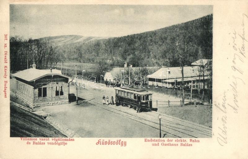 Budapest II. Hűvösvölgy, Villamos vasút végállomása, Balázs vendéglő, étterem. Divald Károly 307. sz. / Endstation der elektr. Bahn und Gasthaus Balázs