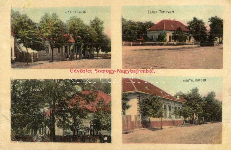 Leírás: Nagybajom, Somogy-Nagybajom; Izraelita iskola, református templom, római katolikus iskola, óvoda (r)