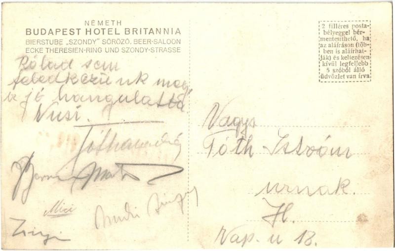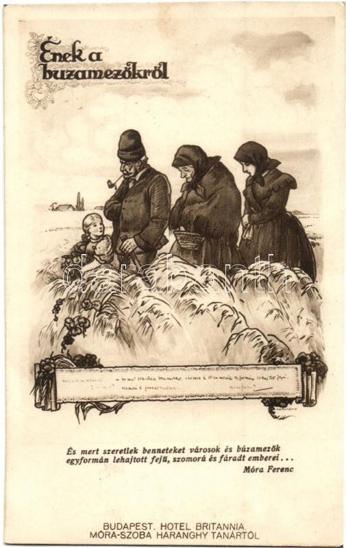 Ének a búzamezőkről. Móra-szoba. A budapesti Hotel Britannia és Szondy Söröző grafikai reklámlapja / Hungarian restaurant advertisement card s: Haranghy (EK)