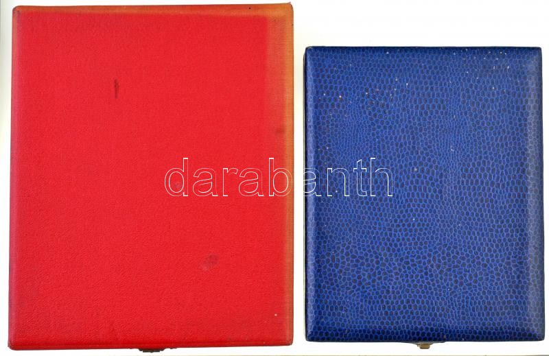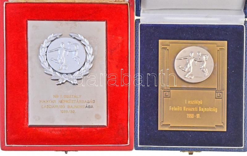 1989. "NB I. osztály Magyar Népköztársaság Labdarugó Bajnoksága 1988/1989" fém plakett, rajta sportdíjérem, eredeti tokban (82x118mm) + 1991. "I. osztályú Felnőtt Nemzeti Bajnokság 1990-1991" Br plakett, rajta ezüstözött díjérem, gravírozva eredeti tokban (71x101mm) T:1-