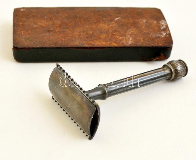 Leírás: Régi borotva megviselt fém dobozban