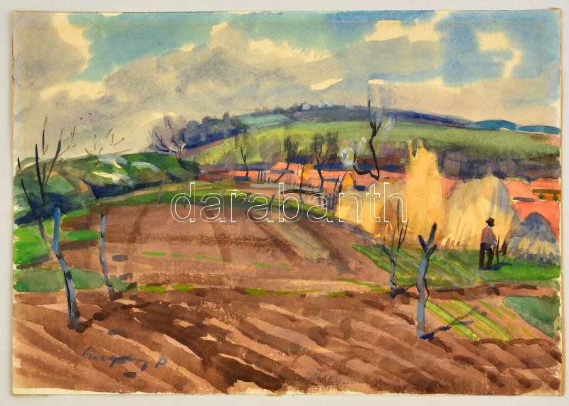 Leírás: Olvashatatlan jelzéssel: Faluhatár. Akvarell, papír, 30×42 cm