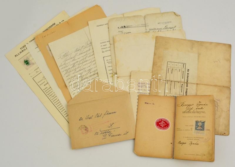 Leírás: Vegyes judaika okmány tétel: igazolás, bizonyítvány, halotti levél, stb., összesen 10 db
