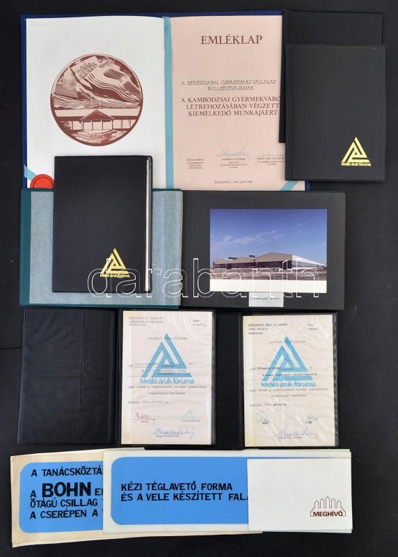 1974-1984 Békéscsabai Tégla- és Cserépipari Vállalat különféle papírjai, kambodzsai gyerekváros emléklap, kiváló áruk fóruma igazolások (5 db), fotók a cserépgyárról mappában (15 db fotó), különféle nyomtatványok (Cserép törékeny 11 db) és táblák, 25 db