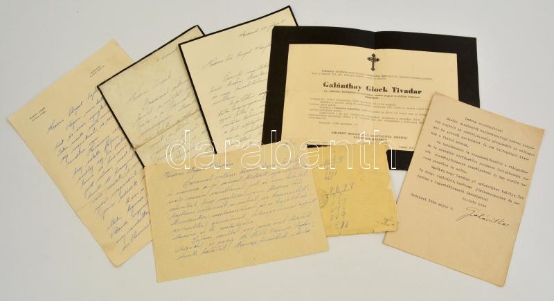 cca 1941-1956 Vegyes papírrégiség tétel, db, levelezések, közte Galánthay Glock Tivadar (1872-1956) vezérőrnagy, országgyűlési képviselő, akadémiai tanár, festő, történész halálozási értesítője, egy levele (aláírással), valamint fia Galánthay Emil egy levele, valamint Galánthay Glock Tivadar ismertségébe tartozó két személy (Baróti Jenő, Argat József) levelezése, benne a világháborút érintő sorokkal, változó állapotban, 7 db.