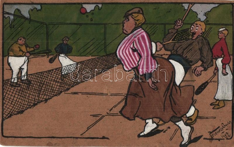 Leírás: 1908 Kolozsvári tenisz társaság / Tennis game. Hungarian art postcard. Letter from the artist s: Ferenczy Gyula (fl)