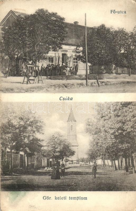 Leírás: Csóka, Coka; Fő utca, görög keleti templom, üzlet / main street, church, shop (EK)