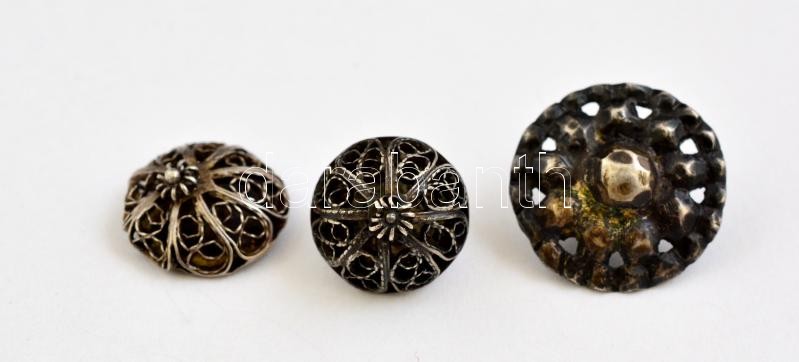 Leírás: Ezüst(Ag) gombok, 3 db, jelzéssel, egyiken horpadás, jelzés nélkül, nettó. 5,4 g