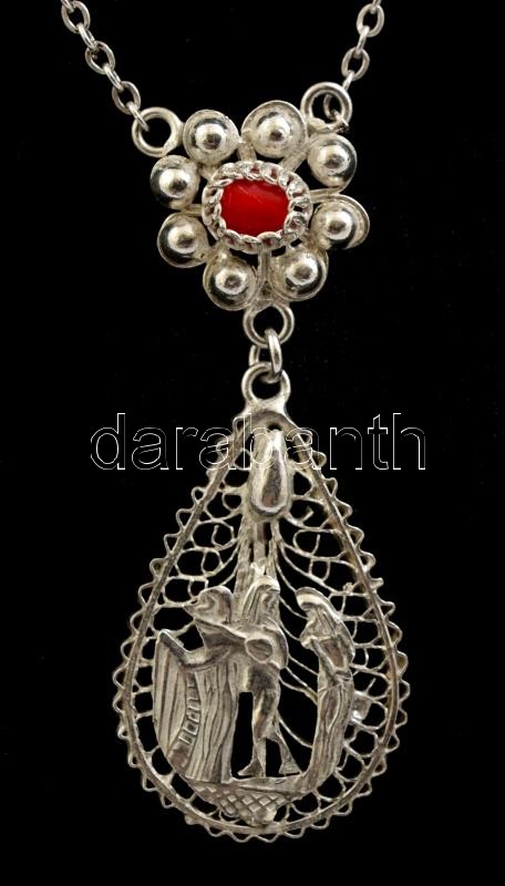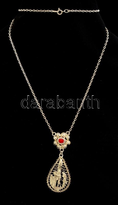 Leírás: Ezüst(Ag) lánc korall berakásos filigrán medállal, jelzett, h: 48 cm, bruttó: 10,1 g