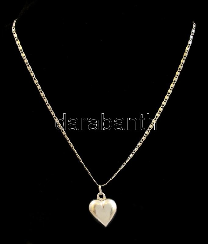 Leírás: Ezüst(Ag) nyaklánc, szív függővel, jelzett, h: 45 cm, 1,5x2,5 cm, nettó: 8,6 g