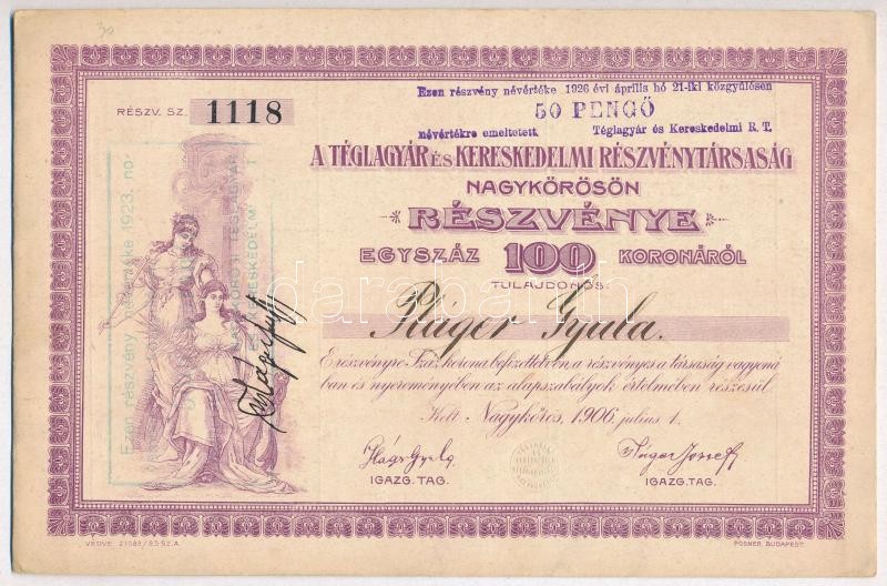 Leírás: Nagykőrös 1906. "A Téglagyár és Kereskedelmi Részvénytársaság" néver szóló részvénye 100K-ról, szárazpecséttel, felülbélyegzésekkel T:I-