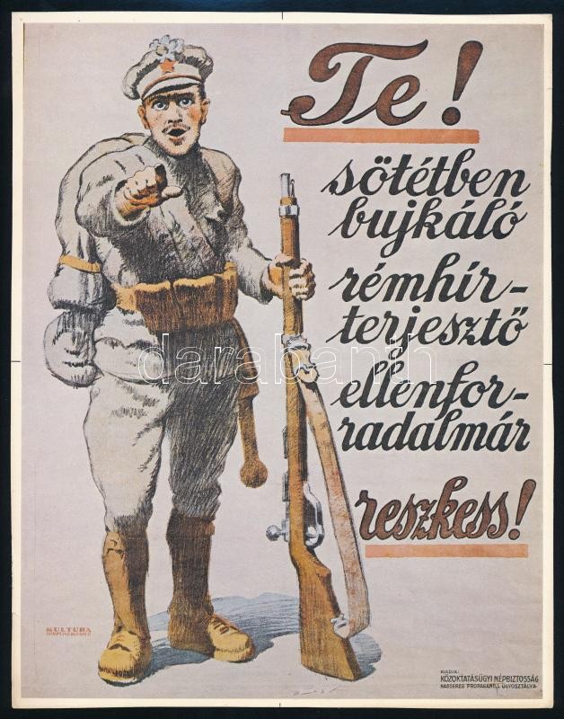 Kónya Sándor "Te! Söténtben bújkáló rémhírterjesztő ellenforradalmár r... https://www.darabanth.com/hu/316-Gyorsarveres/316.0/Festmeny-mutargy-papirregiseg-egyeb/Plakat~28/Konya-Sandor-Te-Sotentben-bujkalo-remhirterjeszto-ellenforradalmar-reszkess-plakatjC3~II1736682