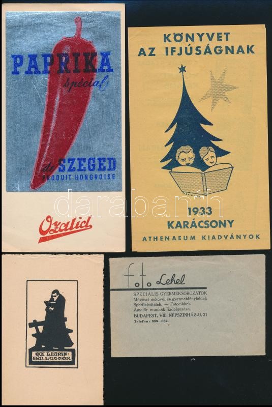 Vegyes reklámnyomtatvány tétel (Paprika Szeged, Könyvet az ifjúságnak, Orsz. Magyar Iparművészeti Társulat, Foto Lehel, Fővárosi Alkalmazottak Nemzeti Szövetsége, stb.)