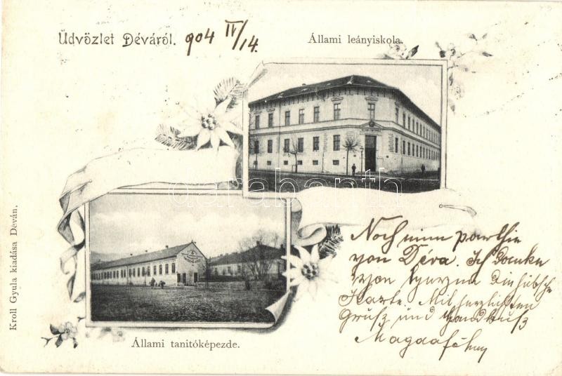 Leírás: Déva, Állami leányiskola és tanítóképezde. Kroll Gyula kiadása / girl school, teachers training school. Art Nouveau, floral (EK)