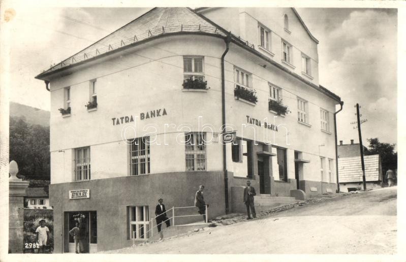 Leírás: Kékkő, Modry Kamen, Blauenstein; Tatra Banka, Magyar József könyv és papírkereskedése, Kemény Dávid üzlete / bank, shops