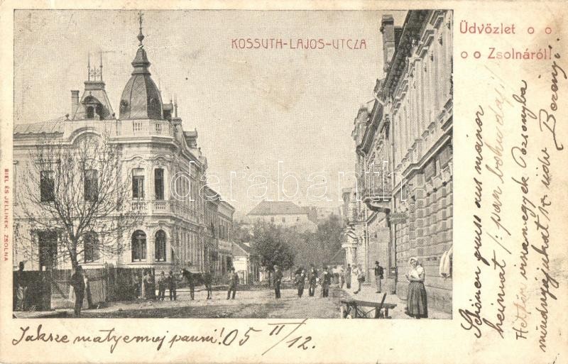 Leírás: Zsolna, Sillein, Zilina; Kossuth Lajos utca, Biel és Jellinek kiadása / street view (EK)