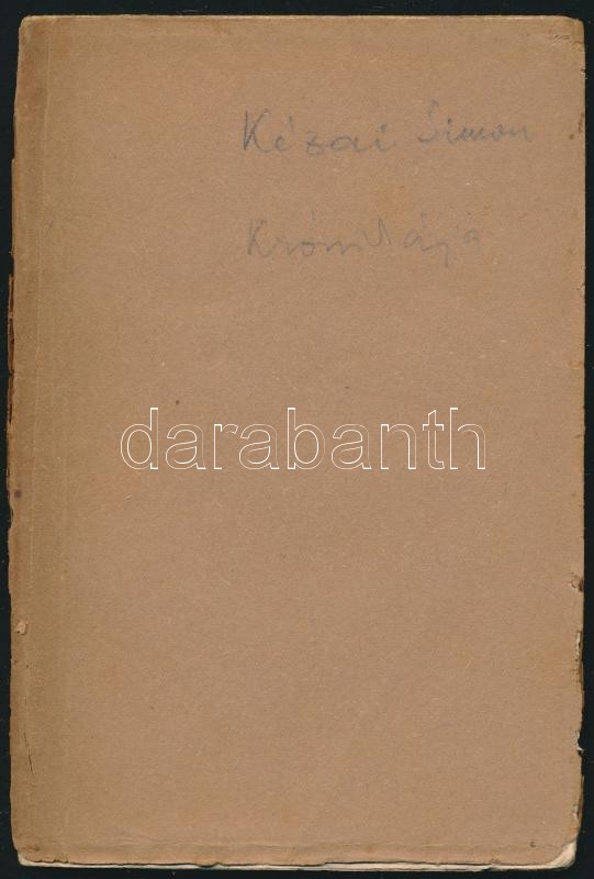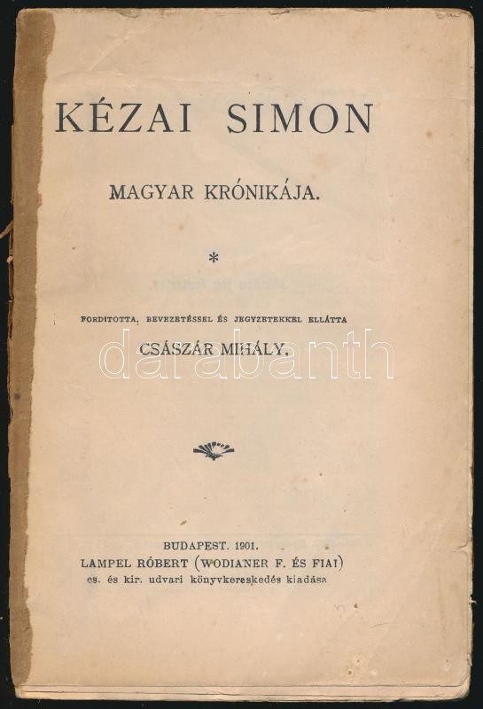 Kézai Simon magyar krónikája. Fordította, bevezetéssel és jegyzetekkel ellátta: Császár Mihály. (Magyar Könyvtár). Bp.,1901, Lampel R. (Wodianer F. és Fiai) Rt., VII+8-75+5 p. Átkötött papírkötés, az elülső borító leszakadt a könyvtestről, az elején ceruzás aláhúzásokkal.