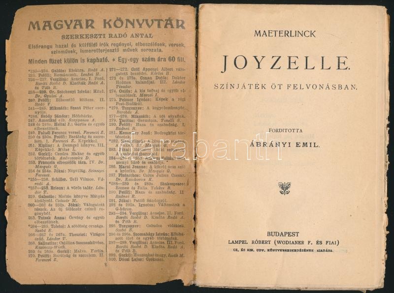 Maeterlink: Joyselle. Színmű három felvonásban. Fordította: Ábrányi Emil. Magyar Könyvtár 377. Bp.,(1904), Lampel R. (Wodianer F. és Fiai) Rt., 76+4 p. Kiadói papírkötés, szakadt borítóval, javított gerinccel, felvágatlan lapokkal.