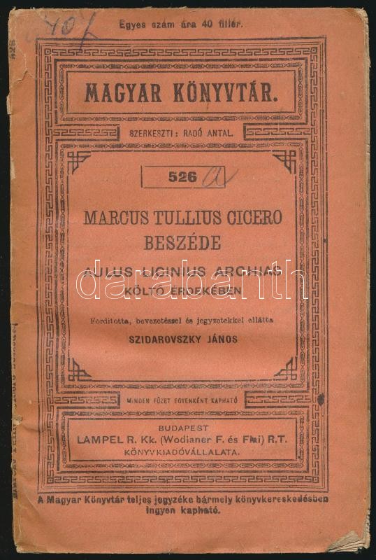 Marcus Tullius Cicero beszéde Aulus Licinius Artchias költő érdekében. Fordította, bevezettéssel, és jegyzetekkel ellátta: Szidarovszky János. Magyar Könyvtár 526. Bp.,é.n., Lampel R. (Wodianer F. és Fiai) Rt., 36 p. Kiadói papírkötés, kissé szakadt borítóval, foltos, ázott lapszélekkel.