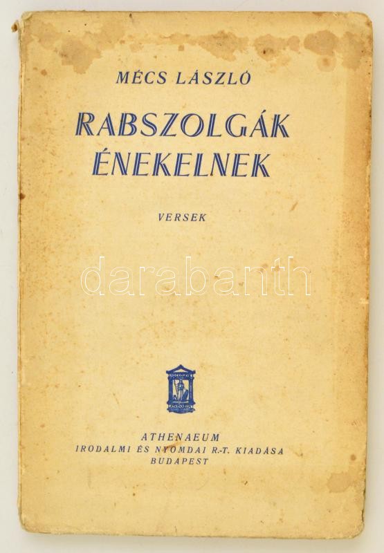 Mécs László: Rabszolgák énekelnek. Versek. Bp.,é.n., Athenaeum. Negyedik kiadás. Kiadói papírkötés, foltos, kissé sérült gerinccel.