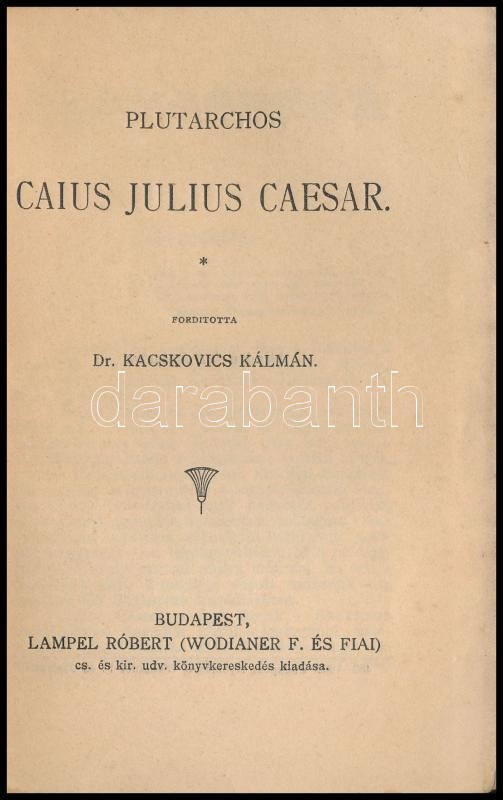 Plutarchos: Caius Iulius Caesar. Fordította: Dr. Kacskovics Kálmán. Magyar Könyvtár 346. Bp.,(1902), Lampel R. (Wodianer F. és Fiai) Rt., 78+2 p. Kiadói papírkötés, javított gerinccel.