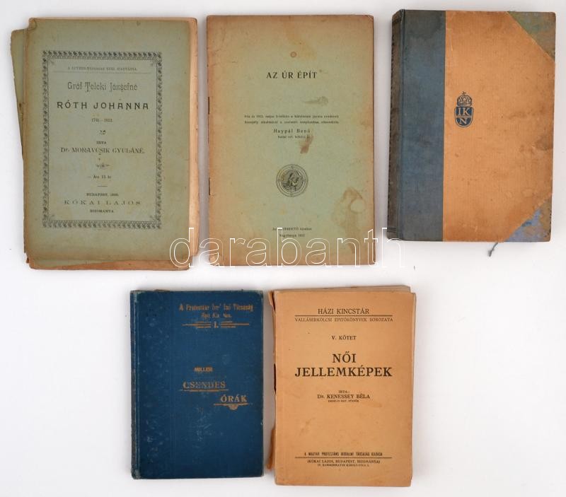 Vegyes vallási könyvtétel, db: Dr. Kenessey Béla: Női jellemképek. Házi Kincstár V. kötet. Bp., 1913, Magyar Prot. Irodalmi Társaság. Kiadói papírkötés, szakadozott gerinccel. Dr. Miller J. R.: Csendes órák. Segédkönyv a bibliának az életbe átvitelére. Házi Kincstár. Fordította: Szász Károly. Bp., 1897, Magyar Prot. Irodalmi Társaság. Korabeli aranyozott egészvászon-kötés, kopott borítóval. A gyermekek szeretetiskolája. Szerk.: Dr. Nógrády László, B. Czeke Vilma. Szolnok,1930, Jász-Nagykun-Szolnok Vármegye Közönsége, (Kir. M. Egyetemi Nyomda Bp.) Kiadói félvászon-kötés, kopott, foltos. Erőss Lajos: A nyugaton támadt világosság. Egyházibeszéd. Debrecen, 1909, Városi Könyvnyomda. Kiadói papírkötés, névbejegyzéssel. Dicsőfi József: Emlékezés Kálvinra. Debrecen, 1909, Debreceni Református Egyház, Városi Könyvnyomda. Kiadói papírkötés, névbejegyzéssel. Haypál Benő: Az úr épít. Nagybánya, 1912, Igehirdető. Kiadói papírkötés, kissé szakadt, foltos borítóval. Szeberényi Lajos Zs: Luther Márton élete. Luther-Társaság III. kiadványa. Bp., 1900, Luther-Társaság. Második kiadás. Kiadói papírkötés, szakadt borítóval. Dr. Moravcsik Gyuláné: Gr. Teleki Józsefné Róth Johanna 1741-1813. Luther-Társaság XXXI. kiadványa. Bp., 1889, Kókai Lajos. Kiadói papírkötés, a borító leszakadt a könyvtestről.