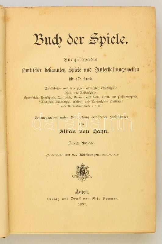 Von Hahn, Alban: Buch der Spiele. Encyklopädie sämtlicher bekannten Spiele und Unterhaltungsweisen für alle Kreise. Zweite Auflage. Mit 227 Abbildungen. leipzig, 1897, Verlag und Druck von Otto Spamer. Német nyelven. Kiadói festett, aranyozott egészvászon kötés, kopottas állapotban. / In German, linen bindig, worn condition.