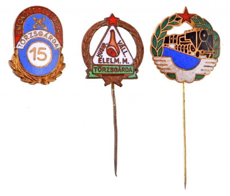 3db-os zománcozott jelvény és kitűző tétel a szocialista időszakból, benne "Lenfonó és Szövőipari V. 15 Törzsgárda", "Húsip. Élelm. M. Váll. Törzsgárda" és Magyar Államvasutak T:2,2-