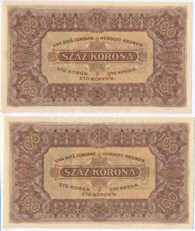 Leírás: 1923. 100K (2x) "Magyar Pénzjegynyomda Rt." nyomdahely jelöléssel T:I