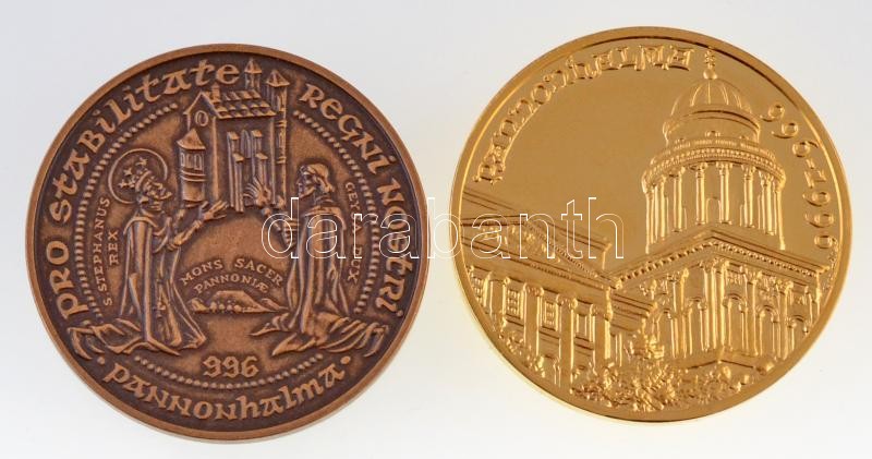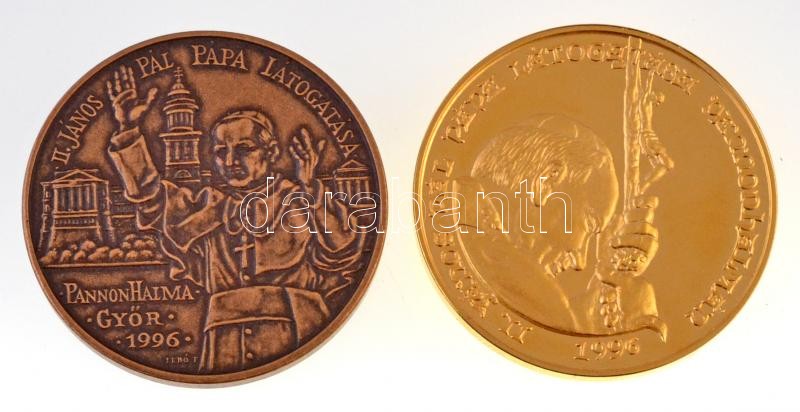 Bognár György (1944-) 1996. "II. János Pál pápa látogatása Pannonhalmán" aranyozott fém emlékérem (42,5mm) + Lebó Ferenc (1960-) 1996. "II. János Pál pápa látogatása - Pannonhalma, Győr" Br emlékérem (42,5mm) T:1-,PP