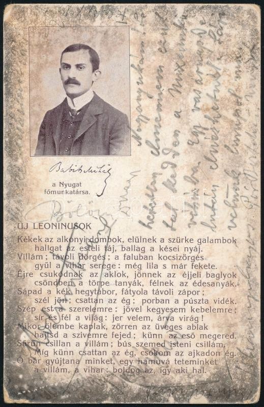 Leírás: 1911 Tihanyi Lajos, Pór Bertalan festőművészek és Feleky Géza, Bálint Aladár, Bölöni György, Bölöni Györgyné írók, újságírók aláírásai, Nyugat folyóirat képeslapján