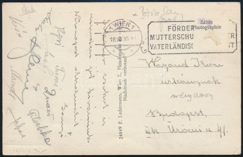 1936 A Hungária focicsapat tagjai, benne a magyar válogatott tagjai és Bíró Sándor (1911-1988) által aláírt képeslap Tischka, Turai, Szabó, Sebes Gusztáv Bécsből. / Hungarian football team autograph signed postcard