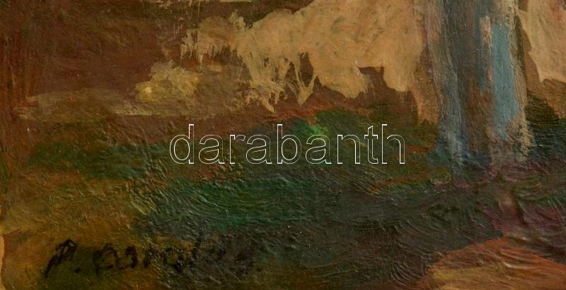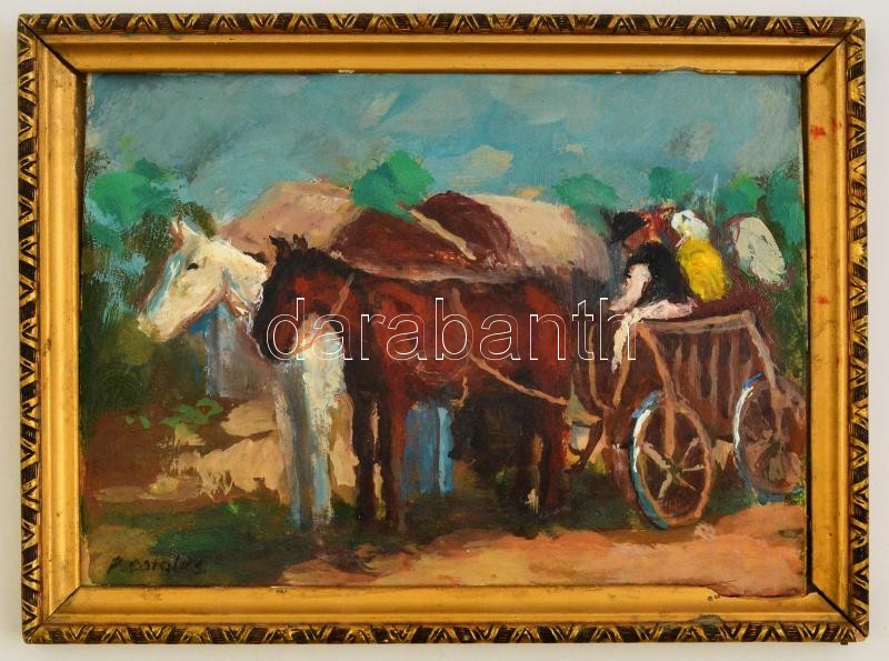 Leírás: Carolus jelzéssel: Lovaskocsi. Olaj, karton, sérült keretben, 17×24 cm