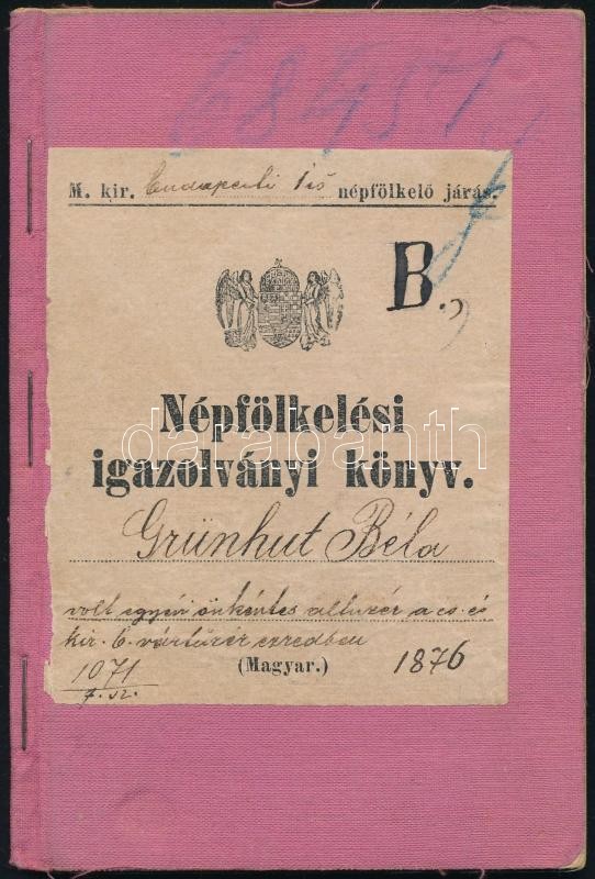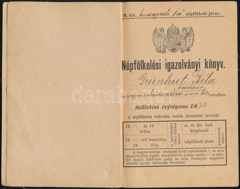 1900 Bp., Népfölkelési igazolványi könyv https://www.darabanth.com/hu/317-Gyorsarveres/317.0/Festmeny-mutargy-papirregiseg-egyeb/Militaria~29/1900-Bp-Nepfolkelesi-igazolvanyi-konyv~II1741978