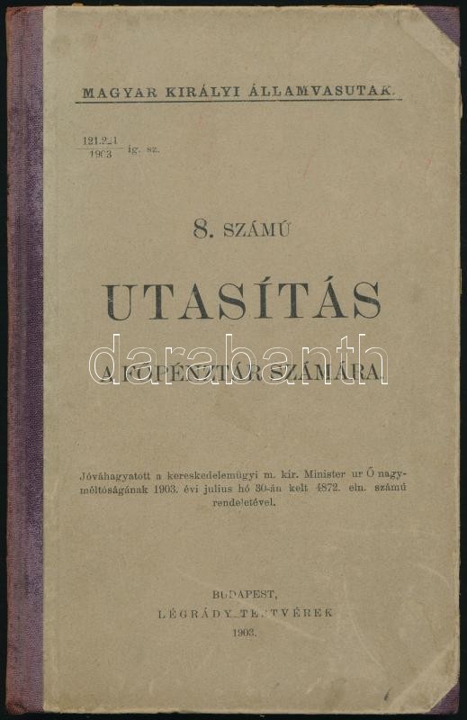 Leírás: 1903 Magyar Királyi Államvasutak (MÁV) 8. számú utasítás. A főpénztár számára. Félvászon kötésben, Légrády Testvérek, 66 p.