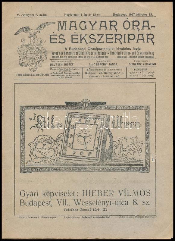 1927 Bp., Magyar Óra- és Ékszeripar V. évfolyam 6. szám https://www.darabanth.com/hu/317-Gyorsarveres/317.0/Festmeny-mutargy-papirregiseg-egyeb/Nyomtatvanyok~31/1927-Bp-Magyar-Ora-es-Ekszeripar-V-evfolyam-6-szam~II1742954