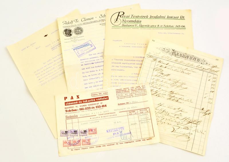 Leírás: 1869-1945 Fejléces számlák és levélpapírok (Adolf Fr. Clemen, Pax ciánozó és takarító vállalat, Révai Testvérek Irodalmi Intézet Rt.), 4 db
