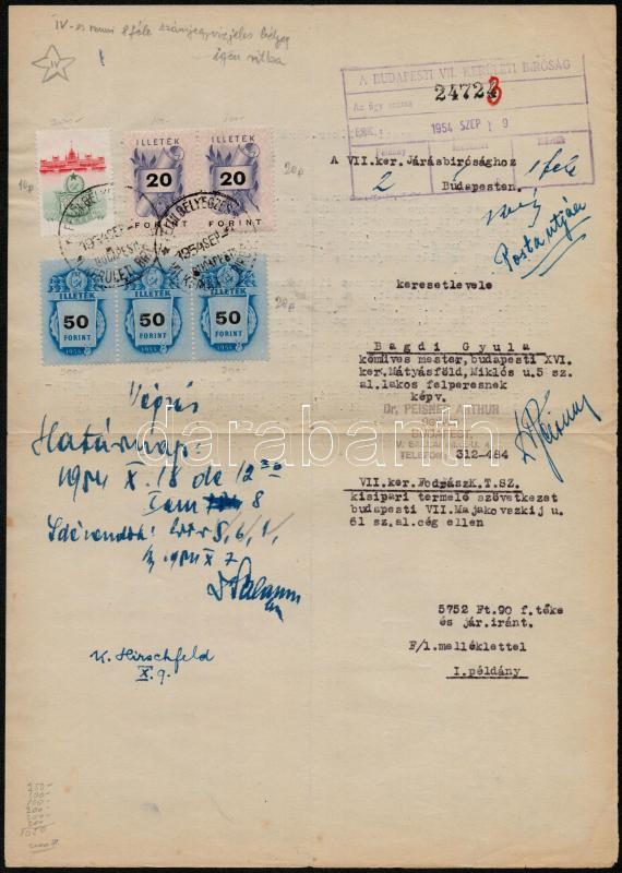 1954 Keresetlevél okmánybélyegekkel https://www.darabanth.com/hu/317-Gyorsarveres/317.0/Festmeny-mutargy-papirregiseg-egyeb/Okmanyok~20/1954-Keresetlevel-okmanybelyegekkel~II1741366