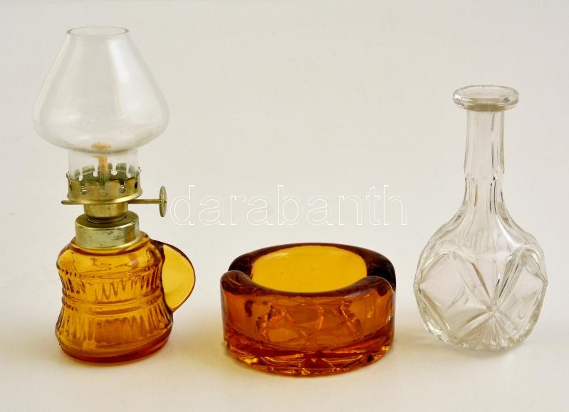 Vegyes üvegtétel, 3 db, hamutartó, illatszeres üvegcse, mini olajlámpás, az egyik címkével jelzett, változó állapotban, az egyik kopott, a másik csorba, m: 3 cm és 15 cm közötti méretben