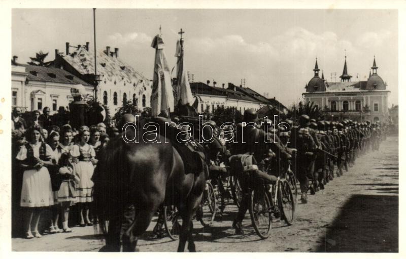 1940 Máramarossziget, Sighetu Marmatiei; bevonulás, kerékpáros katonák és honleányok. Magyar szalaggal a hátoldalon / entry of the Hungarian troops, soldiers with bicycle and compatriot women. Real Hungarian ribbon on the backside. So. Stpl