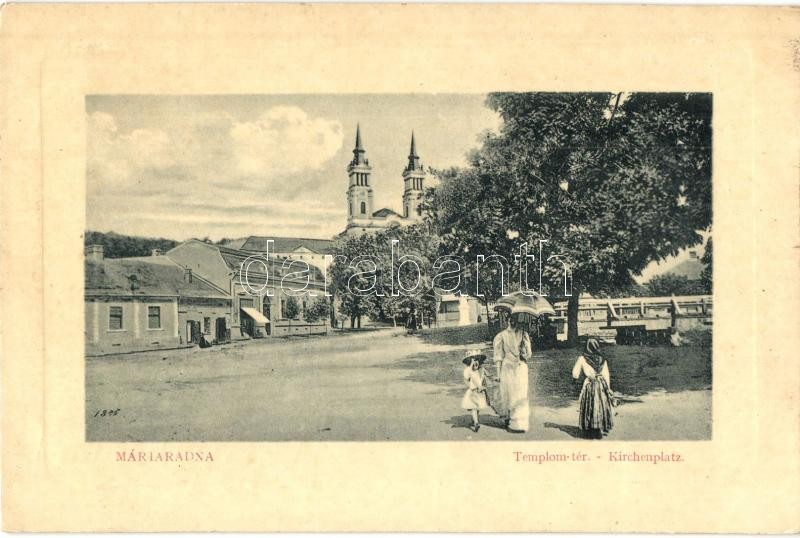 Leírás: Máriaradna, Radna; Templom tér esernyős hölggyel. W. L. Bp. 3021. Csauscher József kiadása / Kirchenplatz / church square, lady with umbrella